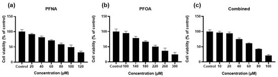 Cell viability was assessed using the MTS assay. HEKn cells were seeded into 96-well plates at a density of 1 × 104 cells per well and allowed to attach for 24 h. Cells were then treated with a range of concentrations of PFNA, PFOA, or a combination of both compounds (Combined PFASs). All PFAS reagents were purchased from Sigma-Aldrich (St. Louis, MO, USA) and dissolved in triple-distilled water. After 24 h of treatment, 20 μL of CellTiter 96® AQueous One Solution Cell Proliferation Assay reagent (Promega, Madison, WI, USA) was added to each well, followed by incubation at 37 °C for 2 h. Absorbance was measured at 490 nm using a microplate reader. Cell viability was calculated by comparing the absorbance values of treated wells to those of the untreated control group. Data were presented as mean ± SD, and all experiments were performed in sextuplicate (n = 6).