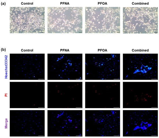 Morphological changes and cell death in HEKn cells following PFAS exposure. (a) Representative phase-contrast images (10× magnification) of HEKn cells treated with PFNA, PFOA, or a combined mixture at their respective IC25 concentrations for 24 h. (b) Apoptosis was assessed using Hoechst 33342/PI double staining and observed under fluorescence microscopy (20× magnification). Hoechst 33342 stained all nuclei blue, whereas PI specifically stained the nuclei of cells with damaged membranes in red. Images are representative of at least three independent experiments. (Scale bar = 100 μm).