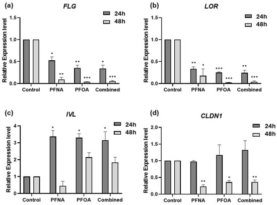 In PFAS-treated HEKn cells, FLG expression was significantly downregulated at both 24 and 48 h (Figure 3a), with a time-dependent decrease observed in all treatment groups. LOR was significantly downregulated at both time points (Figure 3b), with a more marked reduction at 48 h. In contrast, IVL expression was significantly upregulated at 24 h in all PFAS groups (Figure 3c), and while its expression declined slightly at 48 h, it remained elevated compared to controls. This upregulation may reflect a compensatory mechanism in response to barrier disruption caused by reduced FLG and LOR expression, as has been reported in barrier-defective skin models []. CLDN1 expression remained unchanged at 24 h in all treatment groups (Figure 3d). However, by 48 h, significant downregulation was observed in all PFAS-treated cells, suggesting a delayed but notable disruption of tight junction integrity.