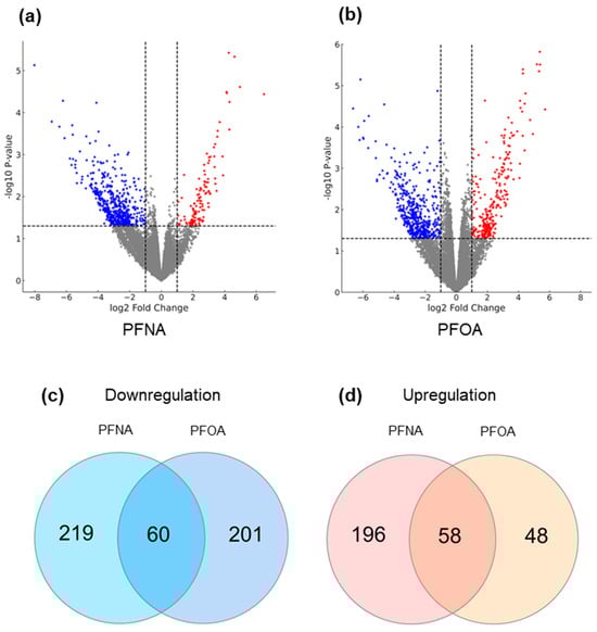 Differential gene expression and shared gene sets under high PFAS exposure and AD conditions. (a) DEG analysis was conducted by comparing the high-exposure atopic group to the low-exposure non-atopic group for (a) PFNA and (b) PFOA. Volcano plots display significantly altered genes. Dashed lines represent the cutoffs for significance (log2 fold change = ±1 and p = 0.05), and the grey area indicates non-significant genes. Upregulated and downregulated genes are shown in red and blue, respectively. To isolate genes uniquely influenced by both PFAS exposure and AD status, additional DEG comparisons with the low-exposure atopic and high-exposure non-atopic groups were performed, and overlapping genes were excluded. The remaining genes were analyzed by Venn diagrams to identify (c) downregulated genes and (d) upregulated genes in both PFNA and PFOA groups.