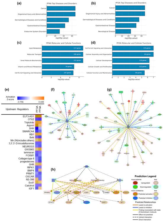 Ingenuity Pathway Analysis (IPA) of PFNA- and PFOA-induced transcriptomic changes under atopic dermatitis conditions. (a,b) Top enriched categories in the “Diseases and Disorders” domain for PFNA and PFOA, respectively. (c,d) Top molecular and cellular functions affected by each PFAS, ranked by –log10(p-value). (e) Predicted upstream regulators for PFNA and PFOA exposures, visualized based on z-scores indicating predicted activation or inhibition. (f,g) Gene networks of calcitriol-regulated downstream molecules, filtered from DEG datasets of PFNA- and PFOA-exposed atopic groups. (h) A broader upstream interaction network centered on calcitriol and its key downstream regulators, inferred from the IPA knowledge base. Node shapes indicate molecular categories defined by IPA.