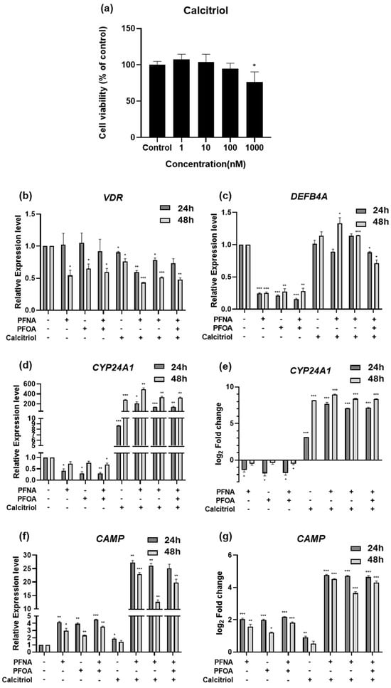 Gene expression changes following treatment with calcitriol alone or in combination with PFASs in HEKn. (a) Cell viability was assessed by MTS assay after 24 h treatment with increasing concentrations of calcitriol. HEKn cells were treated with PFASs, calcitriol, or a combination for 24 or 48 h. Results are presented as mean ± SD from at least three independent experiments performed in sextuplicate. The mRNA expression levels of calcitriol-related genes, including (b) VDR, (c) DEFB4A, (d,e) CYP24A1, and (f,g) CAMP, were quantified by RT-qPCR. Expression values were normalized to GAPDH and presented as relative expression or log2 fold change compared to untreated controls. Data represent mean ± SEM from at least three independent experiments, each performed in triplicate. Statistical significance was determined using Student’s t-test: * p < 0.05, ** p < 0.01, *** p < 0.001.