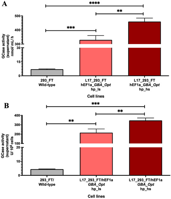 Intracellular GCase activity in L17_293FT_GBA_OPT_HP cells. (A) Intracellular GCase activity in cell lysates (nmol of hydrolyzed substrate per mg of total protein per hour) was significantly higher in the L17_293FT_GBA_OPT_HP population (307.5 ± 53.49 nmol/mg/h) compared to 293FT/wild-type controls (95.58 ± 16.5 nmol/mg/h; p = 0.0026; t = 7.572, df = 3.566; n = 4). (B) GCase activity normalized per million cells (U GCase/106 cells) also showed enhanced production in the L17 population (159.3 ± 44.97 U/106 cells) versus controls (60.2 ± 19.35 U/106 cells; p = 0.0149; t = 4.048, df = 4.074; n = 4). Statistical analysis was performed using a two-tailed unpaired t-test with Welch’s correction. * indicates p ≤ 0.05; ** indicates p ≤ 0.01. [293_FT = human embryonic kidney cells expressing SV40 large T antigen]; [hEF1α = human elongation factor 1-alpha promoter]; [GBA-Opt = codon-optimized human GBA (glucocerebrosidase) cDNA]; [GCase = β-glucocerebrosidase]; [hp = puromycin-selected heterogeneous population].