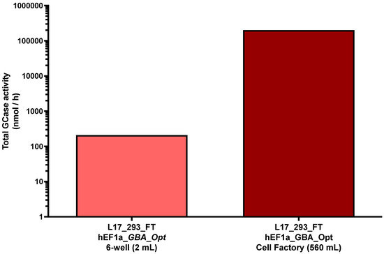 Total GCase production at different culture scales. Total β-glucocerebrosidase (GCase) activity (nmol/h) measured in the supernatant of 6-well plate (2 mL) and 10-layer cell factory system (560 mL) for the L17_293FT_GBA_OPT_HP cell line. “Total” refers to the absolute amount of enzyme produced per hour, calculated by multiplying the specific activity (nmol/mL/h) by the respective culture volume. A 963-fold increase in total enzyme production was observed upon scale-up, with preserved volumetric activity. Values are presented on a base-10 logarithmic scale. [293_FT = human embryonic kidney cells expressing SV40 large T antigen]; [hEF1α = human elongation factor 1-alpha promoter]; [GBA-Opt = codon-optimized human GBA (glucocerebrosidase) cDNA]; [GCase = β-glucocerebrosidase].