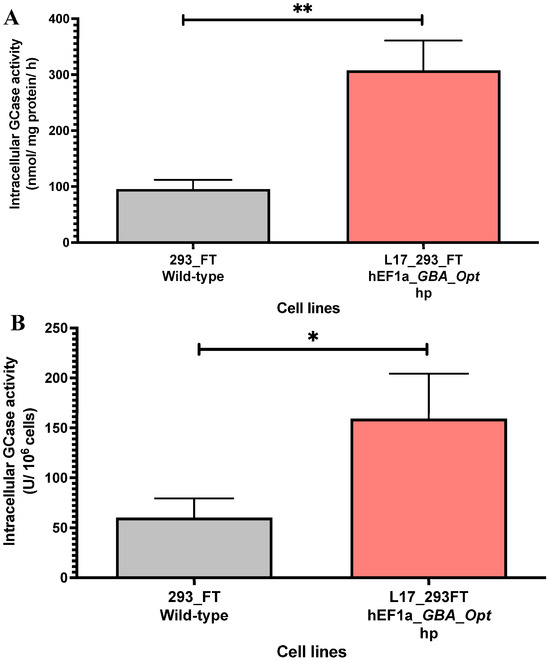 The intracellular GCase activity was quantified in cell lysates from the L17_293FT_GBA_OPT_HP heterogeneous population. Compared to unmodified 293FT cells, the L17 population exhibited significantly higher enzymatic activity. The specific activity reached 307.5 ± 53.49 nmol/mg/h, which represents a 3.2-fold increase relative to control cells (95.58 ± 16.50 nmol/mg/h, p = 0.0026, Figure 3A). When normalized per million cells, the L17 population also demonstrated enhanced intracellular GCase production, reaching 159.3 ± 44.97 U GCase/106 cells, compared to 60.2 ± 19.35 U GCase/106 cells in control cells, a 2.64-fold increase relative to the control (p < 0.05; t = 4.048; df = 4.074, Figure 3B). These findings confirm that the selected population supports increased intracellular GCase secretion following lentiviral transduction and selection.