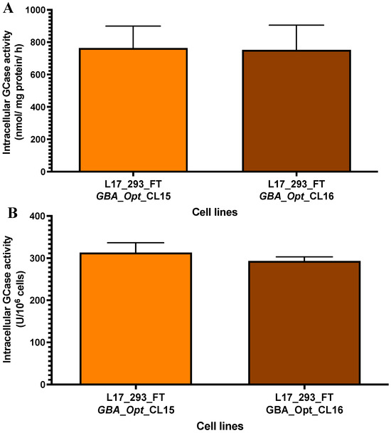 Intracellular GCase activity in L17-derived clones 15 and 16. (A) Intracellular GCase activity in cell lysates (nmol of hydrolyzed substrate per mg of total protein per hour) was comparable between clone 15 (763.8 ± 135.1, n = 3) and clone 16 (752.0 ± 152.1, n = 4), with no significant difference (p = 0.9292; t = 0.106, df = 4.749; n = 3 and n = 4). (B) GCase activity normalized per million cells (U GCase/106 cells) was also similar between clone 15 (313.4 ± 13.4, n = 3) and clone 16 (293.3 ± 4.9, n = 4). Statistical analysis was performed using a two-tailed unpaired t-test with Welch’s correction. ns = not significant. [GCase = β-glucocerebrosidase]; [GBA_Opt_CL15 and CL16 = codon-optimized GBA-expressing single-cell clones derived from the L17_293FT_GBA_OPT line]. The number of replicates (n) for each clone is indicated in the figure legend.