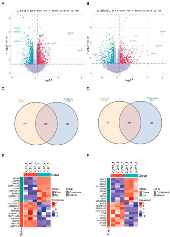 Differential expression analysis. (A,B) Volcano plots of DEGs in HeLa cells after 6 h (A: C_6h vs. V_6h) and 24 h (B: C_24h vs. V_24h) cholesterol exposure. DEGs are defined by |log2FC| > 0.38 (1.3-fold) and p-value < 0.05. Blue dots represent downregulated genes, red dots represent upregulated genes, and purple dots represent genes with no significant expression change. Numbers of downregulated, normal, and upregulated genes are indicated above each plot. (C,D) Venn diagram analysis of DEGs comparing 6 h and 24 h cholesterol treatments. (E,F) Heatmaps depicting the expression patterns of selected DEGs in HeLa cells. Panels illustrate gene expression changes between vehicle-treated and cholesterol-treated groups at 6 h and 24 h timepoints, respectively.