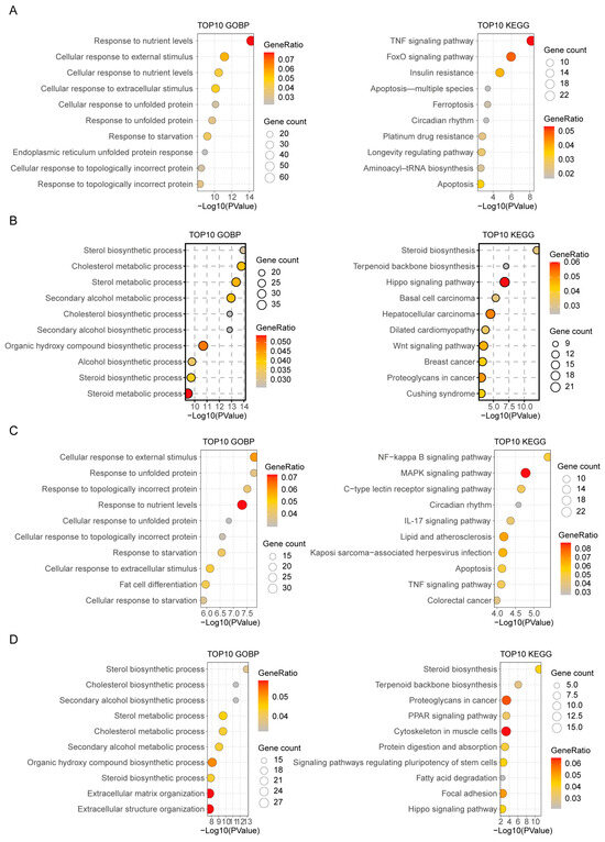 Gene enrichment analysis reveals functional pathway differences in HeLa cells responding to cholesterol stimulation. (A–D) GOBP and KEGG enrichment analyses of DEGs in HeLa cells after cholesterol stimulation. Panels show enrichment results for DEGs at different timepoints of cholesterol exposure, distinguishing biological processes and pathways.