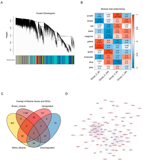 WGCNA of cholesterol-responsive gene networks. (A) Cluster dendrogram of genes. Vertical color bars represent co-expression modules identified by WGCNA, showing hierarchical clustering of genes based on expression similarity across samples. “Height” represents the degree of difference of genes or modules during the clustering process. (B) Heatmap depicting the correlation between WGCNA modules (rows) and experimental groups/traits. Corresponding p-values are in parentheses. The numbers outside the parentheses represent the correlation coefficients between the modules and the traits. (C) Venn diagram showing the intersection of genes from the brown and yellow WGCNA modules with up/downregulated DEGs. (D) STRING-based PPI network of hub genes from the brown and yellow WGCNA modules. Nodes represent proteins, and edges represent interactions.