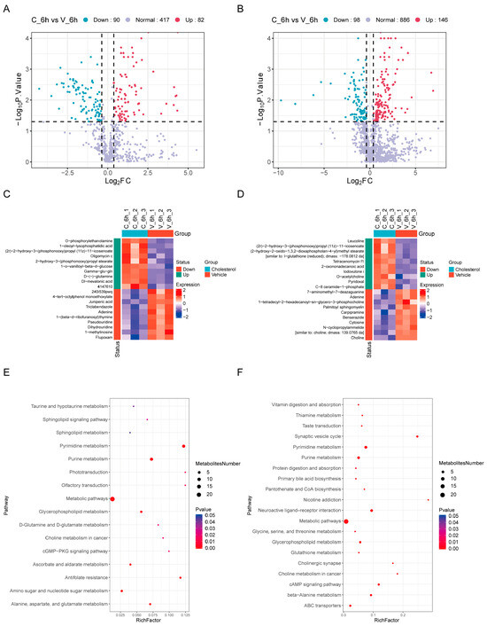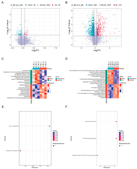 Lipidomic reprogramming in HeLa cells after cholesterol exposure. (A,B) Volcano plots of DAMs in the negative (A) and positive (B) ion modes. Each point represents a metabolite: blue = downregulated, red = upregulated, purple = no significant change. DAMs are defined by |log2FC| > 0.38 (1.3-fold) and p-value < 0.05. (C,D) Heatmaps of DAMs in the negative (C) and positive (D) ion modes. Rows = metabolites, columns = samples (cholesterol/vehicle groups). Color intensity reflects the expression ratio. (E,F) KEGG pathway enrichment of DAMs in the negative ion mode (E) and positive ion mode (F).
