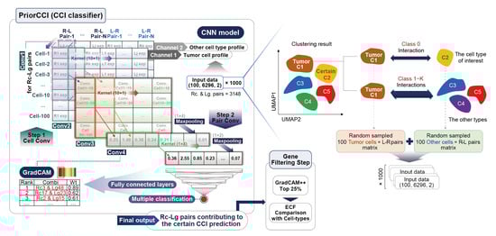 To overcome these limitations, we developed PriorCCI, a deep learning framework designed to prioritize CCIs between specific pairs of cell types. The purpose of this study is to establish a scalable and interpretable deep learning approach that systematically identifies and prioritizes key ligand–receptor interactions between cancer cells and other cell types within the tumor microenvironment (TME) using scRNA-seq data. PriorCCI uses a CNN to integrate gene expression patterns from two cell-type groups and employs Grad-CAM++ for visual interpretation [16] to quantify the contribution of each ligand–receptor pair for the groups based on the learning result by CNN. We applied this method to two independent datasets of lung and colorectal cancers sourced from the Cancer Cell Atlas (CCA) [17,18]. Our analysis identified ligand–receptor pairs uniquely enriched in interactions between tumors and endothelial cells, which may serve as potential targets for angiogenesis-related studies. This approach enables the systematic, cell-type-specific prioritization of CCIs and provides a scalable framework with broad applications in both basic research and translational medicine.