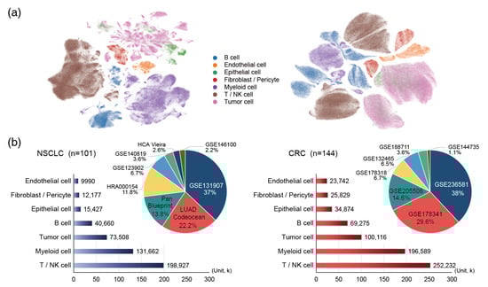 Summary of all datasets used for PriorCCI (a) UMAP presentation with clusters representing the major cell types in the NSCLC and CRC datasets, respectively: NSCLC, Non-small cell lung cancer; CRC, Colorectal cancer. (b) Bar and pie plots for showing the composition of cell-type-specific cell counts and data-source-wise proportions, respectively. NSCLC is on the left, and CRC is on the right.