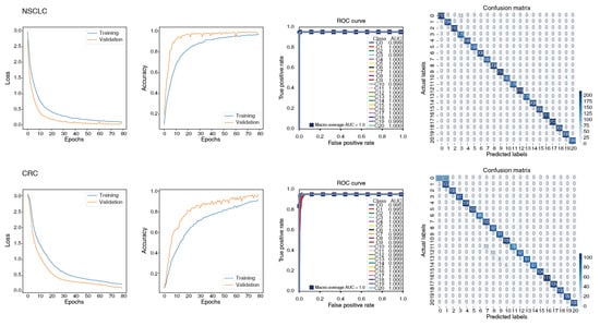 Performance of PriorCCI. The learning curves for loss and accuracy according to epochs, using the training and validation sets, are shown on the left. The right side displays ROC curves and the associated macro-average AUC, as well as the confusion matrix. The upper plots are for NSCLC, and the lower plots are for CRC.