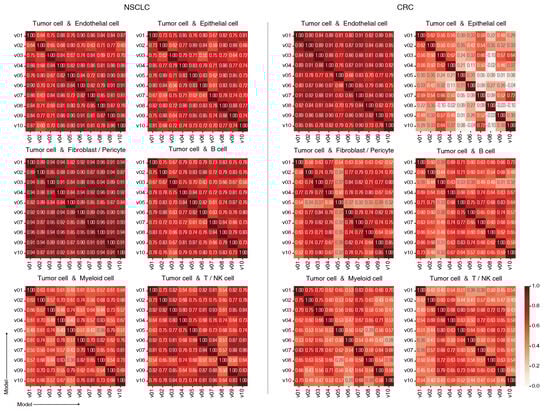 This analysis was performed using scRNA-seq datasets from two epithelial-origin cancers, non-small cell lung cancer (NSCLC) and colorectal cancer (CRC). Both datasets included cancerous and adjacent normal tissues curated in an integrated atlas format. After preprocessing, 36,601 genes were analyzed in 482,351 NSCLC and 702,657 CRC cells. As described in the Materials and Methods section, cell types were annotated and visualized using UMAP, showing a clear separation among seven major groups: tumor, endothelial, fibroblast, myeloid, T/NK, B, and epithelial cells. All possible pairwise combinations (7C2 = 21) were considered in the analysis (Figure 2).