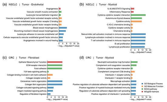 To validate the biological relevance of the genes prioritized by the PriorCCI model, gene set enrichment analysis (GSEA) was performed using the corresponding gene sets [19]. In the NSCLC dataset, interactions between Tumor–Endothelial and Tumor–Myeloid, which are known to play major roles in the TME, were analyzed. In the CRC dataset, Tumor–Fibroblast and Tumor–Myeloid interactions were examined. The enrichment results for these interactions are illustrated in Figure 5, which presents the associated biological pathways identified through GSEA.