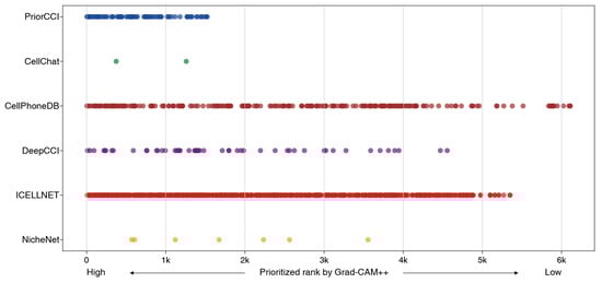 Distribution of gene-pair rankings assigned by each method relative to prioritization in PriorCCI. The horizontal strip plot compares the ranks of ligand–receptor pairs predicted by each CCI analysis method for the Tumor–Endothelial cell interaction. Each dot represents a gene pair detected by one of the tools. The x-axis indicates the Grad-CAM++-based rank in PriorCCI, with higher-priority pairs positioned on the left (top 25%).