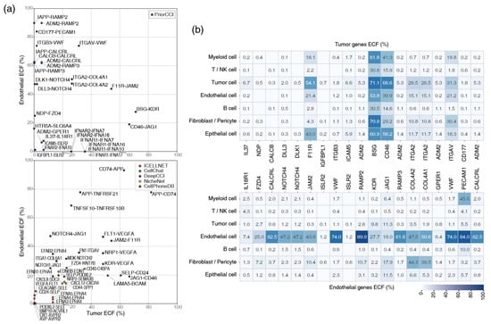 ECF status of ligand–receptor pair candidates specific for the Tumor–Endothelial cell interaction (a) Candidates of gene–gene pairs from PriorCCI (upper) and other methods (lower) are shown as ECF (%) with respect to endothelial cells (y-axis) and tumor cells (x-axis). (b) The ECF values of the PriorCCI candidates according to cell type. The genes from tumor cells (top) and endothelial cells (bottom) are compared in other cell types after filtering out genes with an ECF under 0.1% in all cell types.