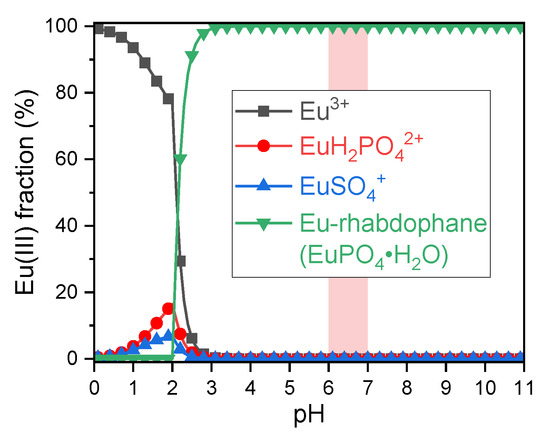 Recent studies have indicated that the primary binding partners for trivalent europium and curium are phosphate, as well as the proteins mucin and amylase [22,52,67]. Thermodynamic modelling of the inorganic fraction also indicates that phosphate plays a pivotal role (see Figure 2). Due to lack of thermodynamic data, organics and enzymes are omitted.