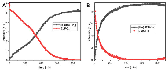 The kinetics of the biological ligands displacement by selected DAs was investigated first. For doing so, TRLF spectra were measured at regular intervals over a period of 15 h. Two approaches were pursued: in the first, only phosphate at its highest concentration typically found in the body fluids was mixed with Eu(III) and EGTA. In a second attempt, the complete GIT was mixed with Eu(III) and HOPO. The obtained spectra were analyzed applying parallel factor analysis (PARAFAC, for more information see Section 3), which yielded the time-dependent displacement of any bioligands from the GIT by the DAs, as shown in Figure 3.