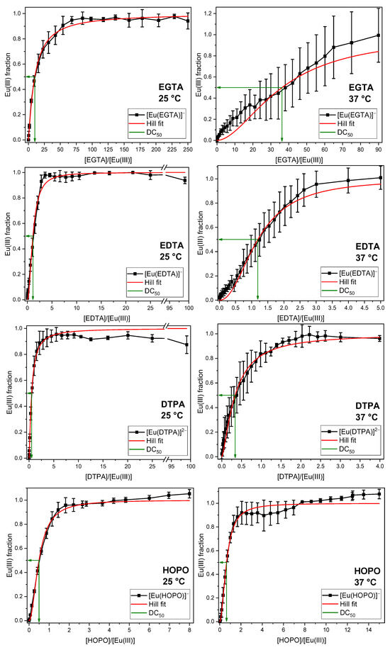 To validate the experimental findings, the DC50 values were thermodynamically modelled (see Figures S20–S25 and Tables S17–S22 Supplementary Materials). The experimentally determined DC50 values reflect the same order as the thermodynamically modelled ones, with the highest DC50 value for EGTA and the lowest for DTPA and HOPO. The thermodynamic calculations show a DC50 value of EDTA 10-fold lower than of EGTA, as was inferred from the experimental results. For DTPA and HOPO, the modelled and observed DC50 values match strikingly, which is due to their high affinity for Eu(III).