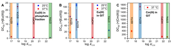 DC50 values of each ligand obtained by displacing experiments in comparison to the complex stability constants log K110 (corresponding to the stoichiometric coefficients of metal ion, ligand, and protons, respectively; see Table 4) of the corresponding complex. (A): Eu(III) in phosphate fraction, (B): Eu(III) in complete GIT, (C): Cm(III) in complete GIT. T = 25 °C (blue) or 37 °C (red).