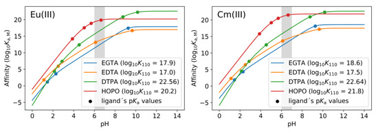 Applying Equation (3) to the parameters of the Eu(III) and Cm(III) complexes of the four DAs in this study (Table 4) shows the pH dependence of the affinity (see Figure 8):