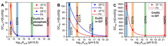 To quantify the efficacy of the different DAs and to facilitate comparison, the excess of DA at which half of the Eu(III) or Cm(III) was bound to the complex was calculated (decorporation concentration, DC50). For additional information, see Section 3.