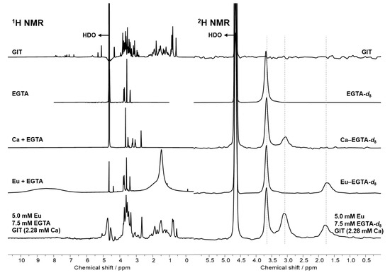 1H (left) and 2H NMR (right) spectra of free EGTA, Ca(II)-, and Eu(III)-bound EGTA and GIT with and without Eu or EGTA.