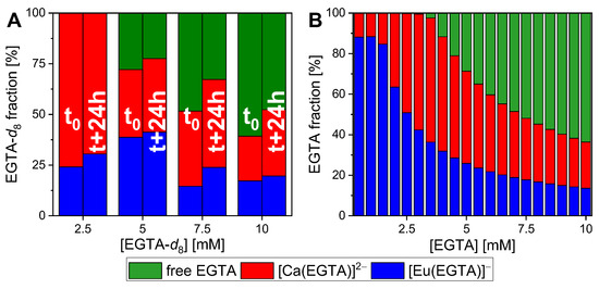 Fractions of free, Ca(II)-, and Eu(III)-bound EGTA in the artificial GIT mixture measured by 2H-NMR spectroscopy (A) and modelled using PHREEQC (B). Each sample was measured immediately after addition of the ligand and the next day. [Ca(II)] = 2.28 mM, [Eu(III)] = 5 mM, pH = 6.5 ± 0.5.
