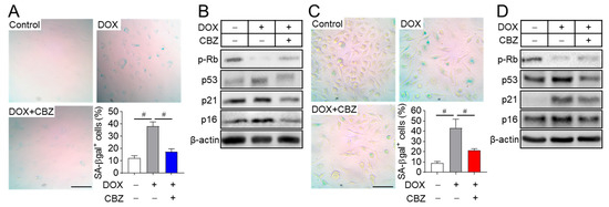 Cabozantinib prevents cellular senescence. Osteoblast (A) and osteoclast progenitors (C) were incubated with 0.2 μM and 1 µM doxorubicin (DOX) for 4 h to induce cellular senescence, followed by treatment with 100 nM cabozantinib (CBZ) for 6 and 4 days, respectively. Cells were stained for SA-β-gal, and images were captured from four randomly selected fields under a microscope. The graph shows the percentage (%) of SA-β-gal-positive cells relative to the total number of cells, averaged from triplicate samples. Scale bar, 100 μm. To evaluate the expression of senescence markers, senescent osteoblast (B) and osteoclast progenitors (D) were treated with 100 nM CBZ for 24 h and 48 h, respectively. Cell lysates were then immunoblotted for phospho-Rb, p53, p21, and p16. β-actin served as the loading control. Scale bar, 100 μm. Data are presented as mean ± SD. # p < 0.01.
