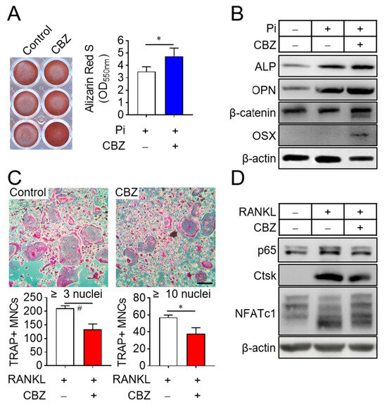 CBZ stimulates osteoblast differentiation and inhibits osteoclast differentiation. (A) Osteoblast differentiation: Senescent osteoblast progenitors were cultured in osteogenic media containing 4 mM phosphate with or without 100 nM CBZ for 10 days. Cells were stained with alizarin red S, and images were acquired by scanning the plate. The dye was solubilized using cetylpyridinium chloride, and absorbance at 550 nm was measured to quantify calcium deposition. (B) Osteogenic gene expression: Osteoblast progenitors were subjected to the indicated treatments, and cell lysates were collected on day 8 of differentiation for immunoblotting with antibodies against ALP, OPN, β-catenin, and OSX. (C) Osteoclast differentiation: Senescent osteoclast progenitors were differentiated into multinucleated osteoclasts in the presence of M-CSF (30 ng/mL) and RANKL (100 ng/mL) in the absence or presence of 100 nM CBZ, for 4 days. TRAP staining was used to identify TRAP-positive multinucleated cells [TRAP(+) MNCs] containing more than 3 or 10 nuclei, which were counted under a microscope. (D) Osteoclastogenic gene expression: After the indicated treatments, osteoclast progenitor lysates were collected on day 4 of differentiation and analyzed via immunoblotting for NFκB p65, Ctsk, and NFATc1. Scale bar, 100 μm. Data are expressed as mean ± SD. * p < 0.05; # p < 0.01.