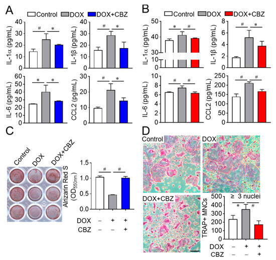 CBZ-mediated SASP repression enhances osteoblast differentiation and inhibits osteoclast differentiation. (A,B) ELISA for SASP factors. Osteoblast and osteoclast progenitors were cultured without or with doxorubicin, followed by further incubation in the absence or presence of CBZ (100 nM) for 4 days and 6 days, respectively. Culture media from osteoblasts (A) and osteoclast progenitors (B) were collected under the same conditions. The levels of SASP factors (TNF-α, IL-1α, ILβ, IL6, and CCL2) were quantified using ELISA. (C,D) Osteoblast and osteoclast differentiation. As in (A,B), conditioned media from control, doxorubicin (DOX), and DOX + CBZ (DOX+CBZ) were mixed 1:1 with fresh media, and used for differentiation of osteoblasts (C) and osteoclasts (D). Differentiated cells were stained with alizarin S and TRAP, respectively, and analyzed microscopically. Scale bar, 100 μm. Data are presented as mean ± SD. * p < 0.05; # p < 0.01.