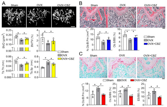CBZ prevents bone loss in ovariectomized mice. (A) µCT analysis: Mice underwent either a sham operation or bilateral ovariectomy (OVX). CBZ (0.25 mg/kg; 500 nM) was administered intraperitoneally every two days for 8 weeks. µCT analysis of femurs was performed to assess bone mineral density (BMD), trabecular bone volume per total tissue volume (BV/TV), trabecular bone thickness (Tb.Th), trabecular bone separation (Tb.Sp). Scale bar, 0.5 mm. Osteoblast analysis: Longitudinal femur sections were stained for H&E to detect osteoblasts (B) and TRAP to analyze osteoclasts (C). NOb/B.Pm, number of osteoblasts per bone perimeter; Ob.S/BS, osteoblast surface per bone surface; NOc/B.Pm, number of osteoclasts per bone perimeter; Oc.S/BS, osteoclast surface per bone surface. Also, TRAP-stained sections were used to determine the eroded bone surface per bone surface (ES/BS). Scale bar, 100 μm. Data are presented as mean ± SD (n = 5 per group). * p < 0.05; # p < 0.01.