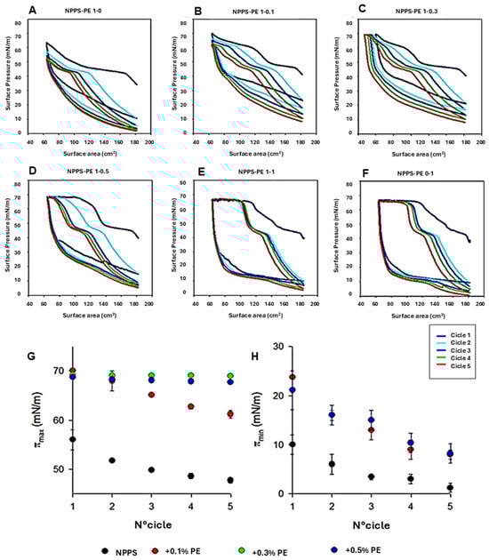 Effect of PE on NPPS compression/expansion cycles. (A–F) π-area isotherms obtained from five cycles for pure NPPS monolayers (A), NPPS-PE blends with molar ratios 1:0.1 (B), 1:0.3 (C), 1:0.5 (D), and 1:1 (E), and pure PE (F). (G,H) Effect of PE on the maximum (πmax) (G) and minimum (πmax) (H) surface pressure reached by the isotherms of NPPS isolated from porcine lung lavages during compression cycles.