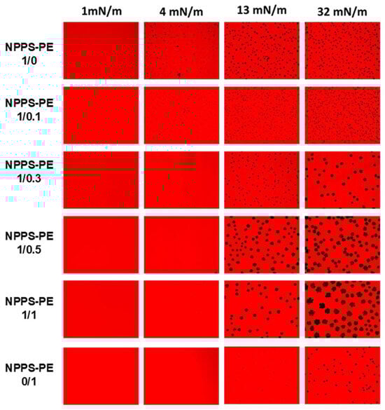 NPPS and PE samples were labeled with 0.1% rhodamine-DOPE (Avanti Polar Lipids, Alabaster, AL, USA) suspended in chloroform:methanol (1:2). Subsequently, 20 µL of the rhodamine-DOPE-labeled NPPS-PE suspension was spread onto the air–liquid interface of the Langmuir film balance, and the organic solvent was allowed to evaporate for 10 min. The interfacial film was then transferred onto a glass coverslip during compression at a constant rate of 25 cm2/min using the Langmuir–Blodgett technique with a continuously varying surface pressures (COVASP) mode []. The transferred films were observed using an epifluorescence Leica DM 4000B microscope (Leica Microsystems, Wetzlar, Germany) equipped with an ORCA R2 10,600 camera (Hamamatsu Photonics K.K., Shizuoka, Japan).
