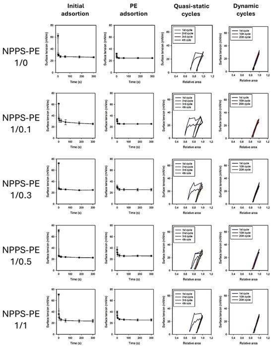 The effect of PE on the ability of NPPS to reduce surface tension (ү) to very low values was evaluated at different PE molar ratios (1/0, 1/0.1, 1/0.3, 1/0.5, 1/1, and 0/1) using a captive bubble surfactometer. Surface tension monitoring was performed under several conditions, including initial and post-expansion adsorption, quasi-static cycling, and dynamic compression–expansion cycling (comparing the first, tenth, and twentieth cycles), both in the presence and absence of PE. The results of these experiments are presented as surface tension versus time isotherms, right after application (initial adsorption) and after a rapid expansion (post-swelling adsorption), and as surface tension versus area fraction isotherms upon compression–expansion cycling. Data are averaged from three experiments, with standard deviation plotted for clarity.