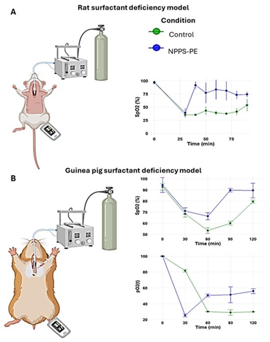 Surfactant deficiency models in animals. (A) Oxygen saturation (SpO2) was monitored using pulse oximetry in rats, while (B) partial oxygen pressure (PaO2) and SpO2 were quantified in blood samples from the right ventricle in guinea pigs. In both models, the groups were the control group and the group treated with NPPS-PE at multiple time points. The results showed that treatment with NPPS-PE improved respiratory parameters over time in both models.