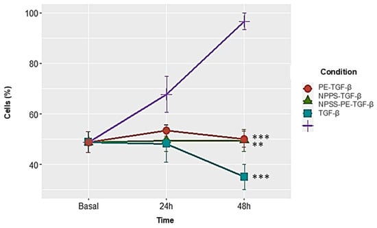 NPPS enriched with PE decreases cell proliferation in NHLF. The growth rate was assessed using the WST-1 assay in three NHLF cell lines derived from three different donors at 24 and 48 h in cells treated with TGF-β as a growth and proliferation inducer. The data presented are the average of three replicates from three independent experiments. Statistical significance: p < 0.001 ** and p < 0.0001 ***.