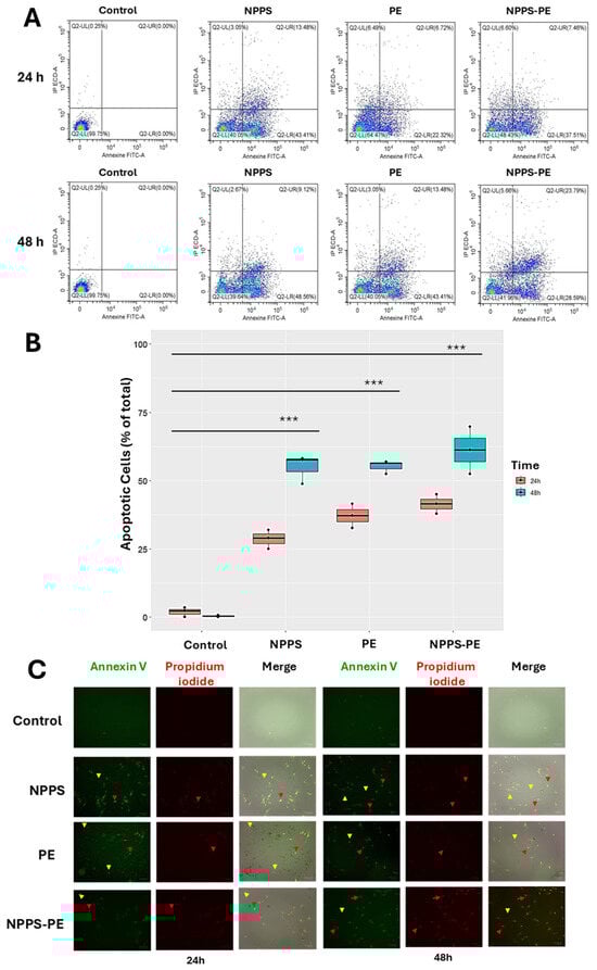 Induction of apoptosis with NPPS-PE evaluated by flow cytometry at 24 and 48 h. The analysis included the following aspects: (A) A graphical representation is provided showing the number of cells in early and late apoptosis in the Q2-LR and Q2-UR panels, respectively. (B) Box plots are shown representing triplicate experiments across three different cell lines and the sum of the quadrants representing apoptosis. Statistical analysis was performed with a significant level of p < 0.05. (C) Representative microphotographs of stained cells using the same fluorophores employed in the cytometry experiments (annexin V and propidium iodide). Yellow arrows indicate the presence of early apoptosis, and red arrows indicate late apoptosis. p < 0.0001 ***.
