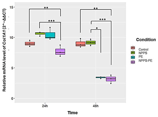 At 24 h, the average expression of Col1A1 was as follows: control group: 9 ± 0.49 2−ΔΔCT; NPPS group: 10.61 ± 0.36 2−ΔΔCT; PE group: 10.47 ± 1.02 2−ΔΔCT; and NPPS-PE group: 7.72 ± 0.93 2−ΔΔCT. Statistical analysis revealed significant differences between the NPPS and NPPS-PE groups (p < 0.0001 ***), as well as between the control and NPPS-PE groups (p < 0.001 **). At 48 h, the average expression of Col1A1 in the control group was 9 ± 0.71 2−ΔΔCT, in the NPPS group, it was 9.16 ± 0.52 2−ΔΔCT, in the PE group, it was 3.41 ± 0.14 2−ΔΔCT, and in the NPPS-PE group, it was 3.15 ± 0.67 2−ΔΔCT. Statistical analysis showed significant differences between the NPPS and NPPS-PE groups (p < 0.0001 ***), between the NPPS and PE groups (p < 0.01 *), and between the control and NPPS-PE groups (p < 0.001 **) (Figure 7).