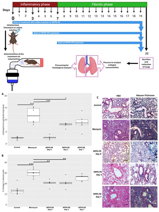 This experimental protocol was approved by the CICUAL (Institutional Animal Care and Use Committee) of the Benemerita Universidad Autonoma de Puebla. All animals were housed under controlled environmental conditions and a 12 h light/dark cycle. Animals were maintained in ventilated cages with standard bedding material and had ad libitum access to food and water. All housing and husbandry conditions were in accordance with international guidelines to ensure animal welfare and minimize stress. The bleomycin model was established using C57BL/6 mice, weighing 30–40 g and six weeks old. The sample size was calculated considering the response seen in a previous study []. Mice were randomly allocated to each group using the random allocation rule with the R package randomizeR, and confounders were not controlled. The provider of the treatment was aware of the group allocation and was not in charge of the measurements. The animals were anesthetized with a mixture of xylazine/ketamine (20 and 100 mg/mL, respectively) at a dose of 0.2 mL per 100 g, and bleomycin instillation was performed intratracheally at a dose of 3U/kg in 30 µL []. Treatments were administered through nebulization, with NPPS-PE 400–80 mg/kg diluted to 1.5 mL with saline solution. Treatments commenced on days 0, 3, and 7 (Figure 9). The animals were euthanized on day 20 under anesthesia. No animals were excluded. The right lung was used for hydroxyproline quantification, while the left lung was subjected to H&E and Masson’s Trichrome staining, with analysis performed using Orbit Image Analysis machine learning software version 3.64.