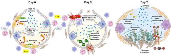 - Day 0—Early inflammatory phase: Bleomycin induces epithelial damage and promotes the release of pro-inflammatory cytokines (IL-6, IL-1β, TNF-α). NPPS-PE particles integrate into the epithelial monolayer, suggesting modulation of the inflammatory response and protection of the basement membrane.