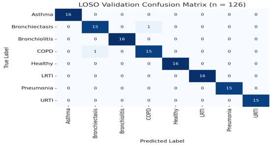 This ensures that each fold reflects a realistic “unseen patient” scenario, without memory contamination from recurrent layers such as LSTM. The strict separation between folds avoids any leakage or fine-tuning biases that could compromise evaluation integrity. The model achieved an average LOSO classification accuracy of 99.99%. Despite high performance, some misclassifications were observed, most notably, between COPD and pneumonia.