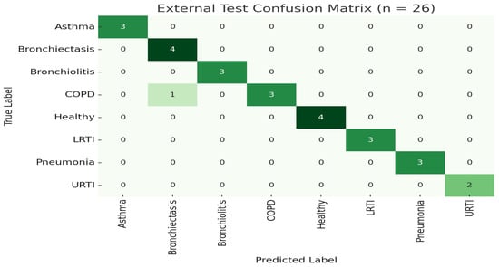 Figure 1. Rare misclassifications occurred primarily between COPD and bronchiectasis, consistent with known auscultatory overlaps [