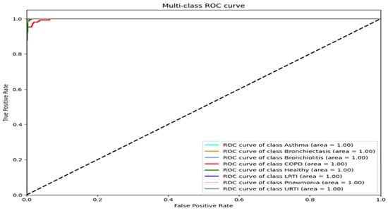 For asthma, bronchiectasis, bronchiolitis, LRTI, and URTI, the model achieved perfect or near-perfect values across all criteria (precision, recall, and F1-score = 0.99–1.00). COPD remained the most error-prone class, with a precision of 0.95 and a recall of 0.99. These errors aligned with LOSO findings and were most common among smokers, where attention layers failed to detect early inspiratory crackles. Across all classes, macro and weighted averages for precision, recall, and F1-score remained at 0.99, highlighting the model’s robust generalization across pathophysiologic variants. The ROC curves confirm strong separability, with AUCs above 0.98 for all classes [