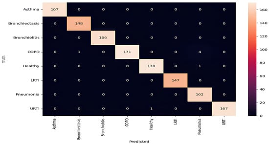 The model achieved perfect classification accuracy (eight out of eight) on this subset. which reflects its strong capability to distinguish between all respiratory classes included in the augmented test dataset. However, the size of the test set remains limited and further validation is necessary in larger and more diverse datasets to confirm the robustness and generalizability of the model in real-world clinical settings. In general, our testing framework verifies the effectiveness of the model in diagnosing multiple respiratory diseases using audio data, utilizing data enhancement to address class imbalance and ensure comprehensive evaluation.