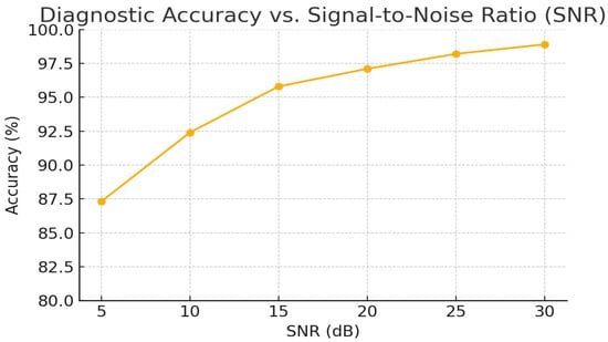 Table 6 reports overall accuracy at SNR = 5, 10, 15, and 20 dB. Even at a challenging SNR of 10 dB, the model maintained over 92% accuracy, demonstrating strong robustness to ambient and device noise.