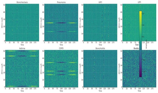 Figure 16 shows representative MFCC spectrograms for eight clinical classes, bronchiectasis, pneumonia, URTI, LRTI, asthma, COPD, bronchiolitis, and healthy respiratory state, highlighting wheezes as horizontal ridges and crackles as vertical spikes. Treating these as 2D images enables CNNs to learn critical spectrotemporal features, aligning with prior successes in audio classification.