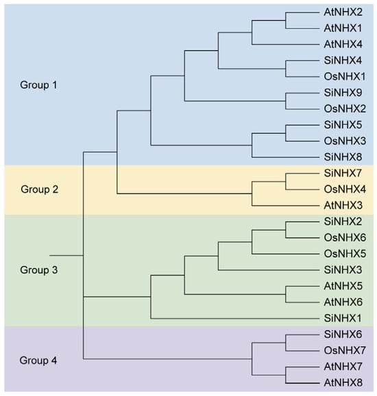 A total of nine SiNHXs were identified after removing duplicate genes from the Yugu1 genome. To gain deeper insights into the evolutionary relationships between foxtail millet and the classical model plant Arabidopsis and the gramineous model plant rice (Oryza sativa), we compared foxtail millet with rice and Arabidopsis NHX gene family members. The phylogenetic tree was constructed using the NHX protein sequences of Arabidopsis, rice, and foxtail millet. The results showed that all NHX members were divided into four groups, among which Group 2 had the smallest members and Group 1 had the largest 10 members. Moreover, in most instances, the homologous groups exhibited monophyletic relationships, with foxtail millet NHX members clustering more closely with rice NHX proteins than Arabidopsis. This indicates that foxtail millet and rice share a closer evolutionary relationship, as they both belong to the Poaceae (Figure 1).