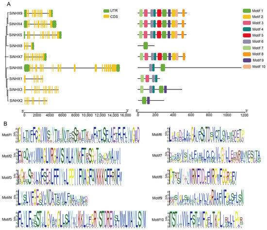 DNA structures and conserved protein motifs of SiNHXs. (A) The DNA structures and conserved protein motifs of the SiNHXs were identified and illustrated using TBtools. Colored rectangles represent different conserved motifs or exons and introns in protein sequences or DNA sequences, respectively. (B) The consensus-conserved motifs of SiNHX proteins were identified in the MEME suite web server.